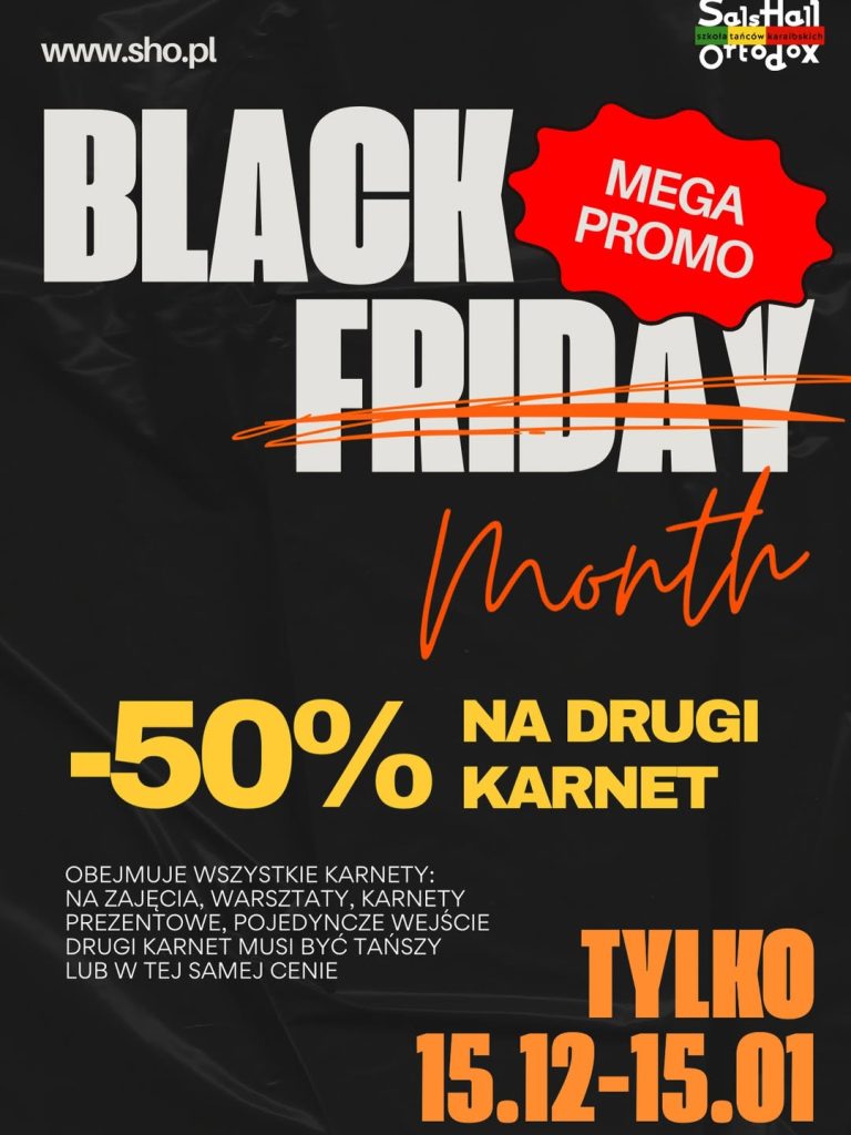 Black Friday? A może lepiej cały Black Month? Bo w Szkole Tańców Karaibskich mamy dla was cały miesiąc promocji! Skorzystajcie z noworocznej promki – 50% na dowolne zajęcia taneczne i karnety w SHO w Warszawie.